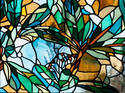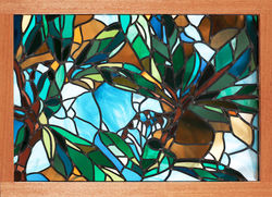 Full rounded rhododendron leafs seemingly dance amid light and air in a passion play of teals, greens and warm yellows.