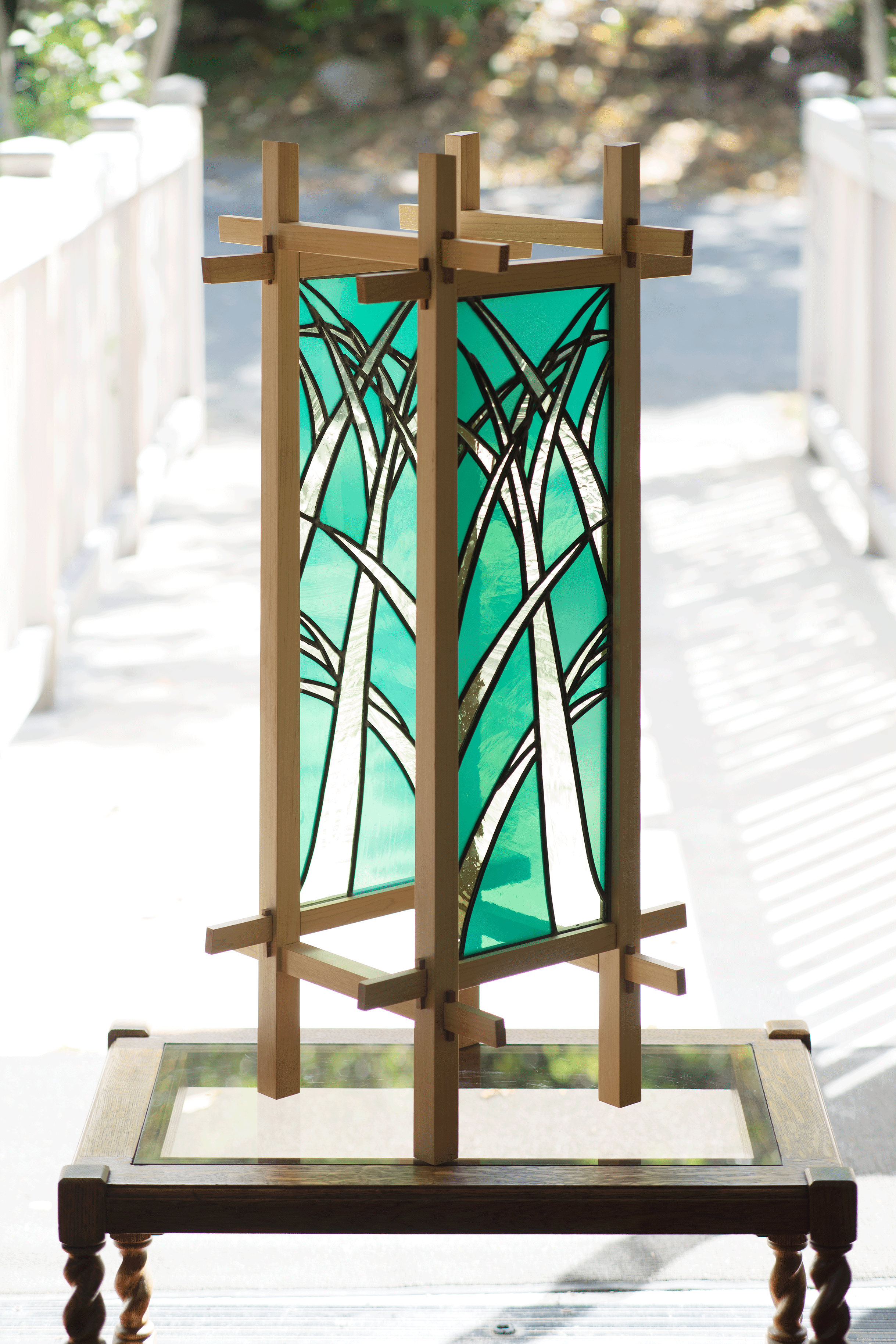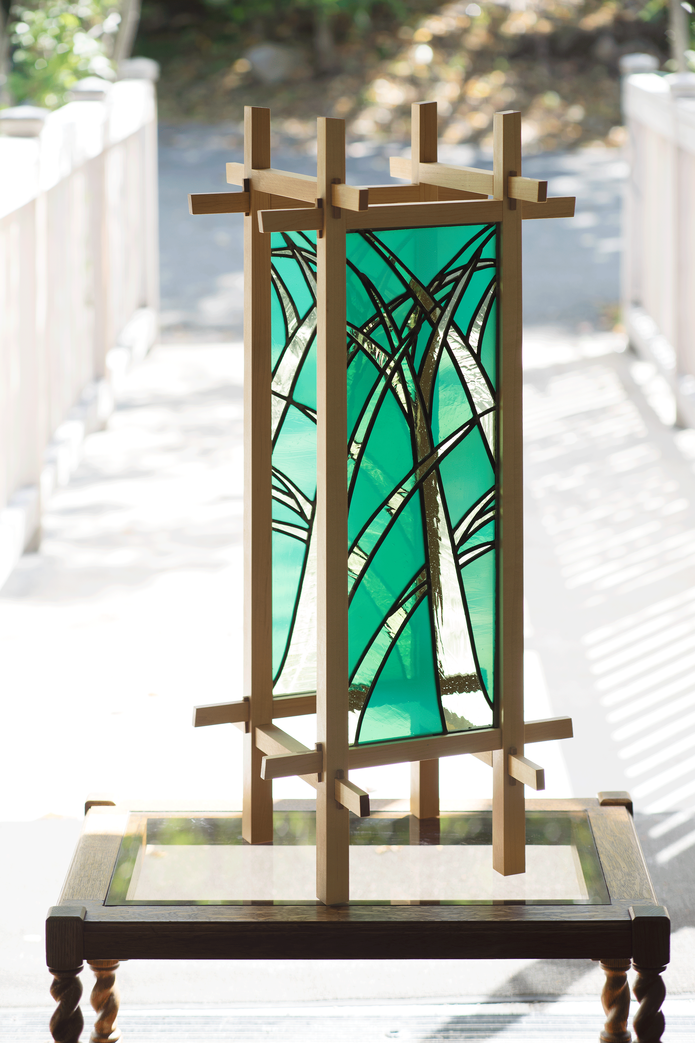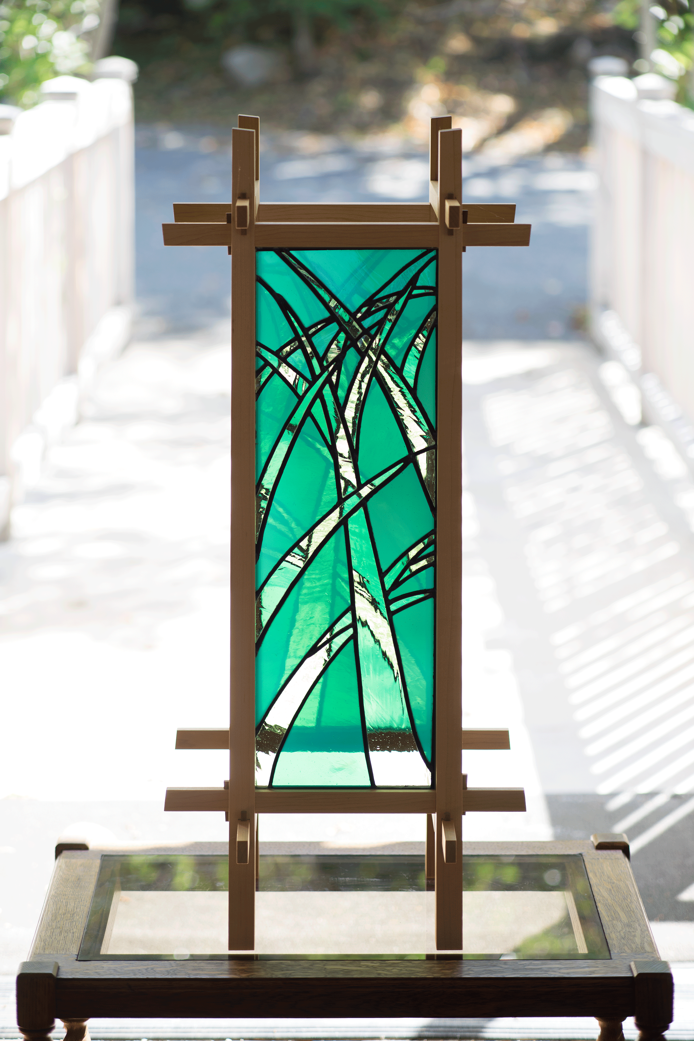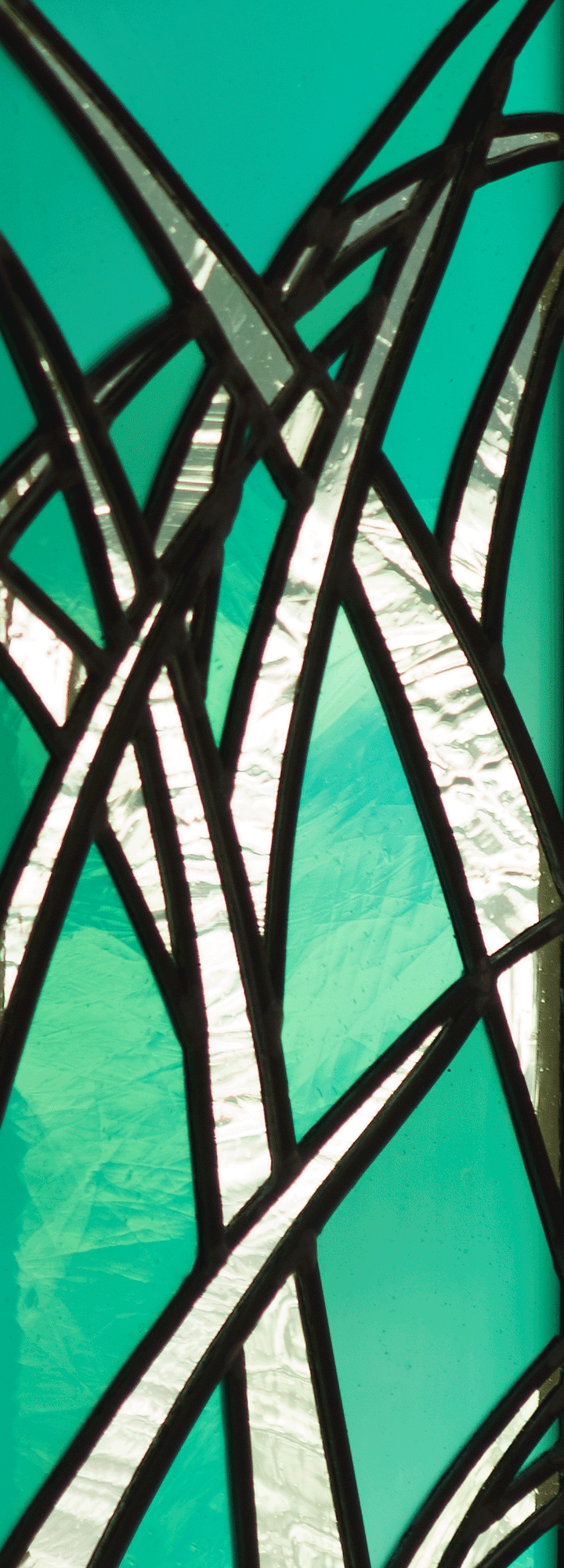 Simple arcing blades of sea green grass reflect, mirror and shadow each other in a layered design that weaves a pattern of light, color, form, and air.