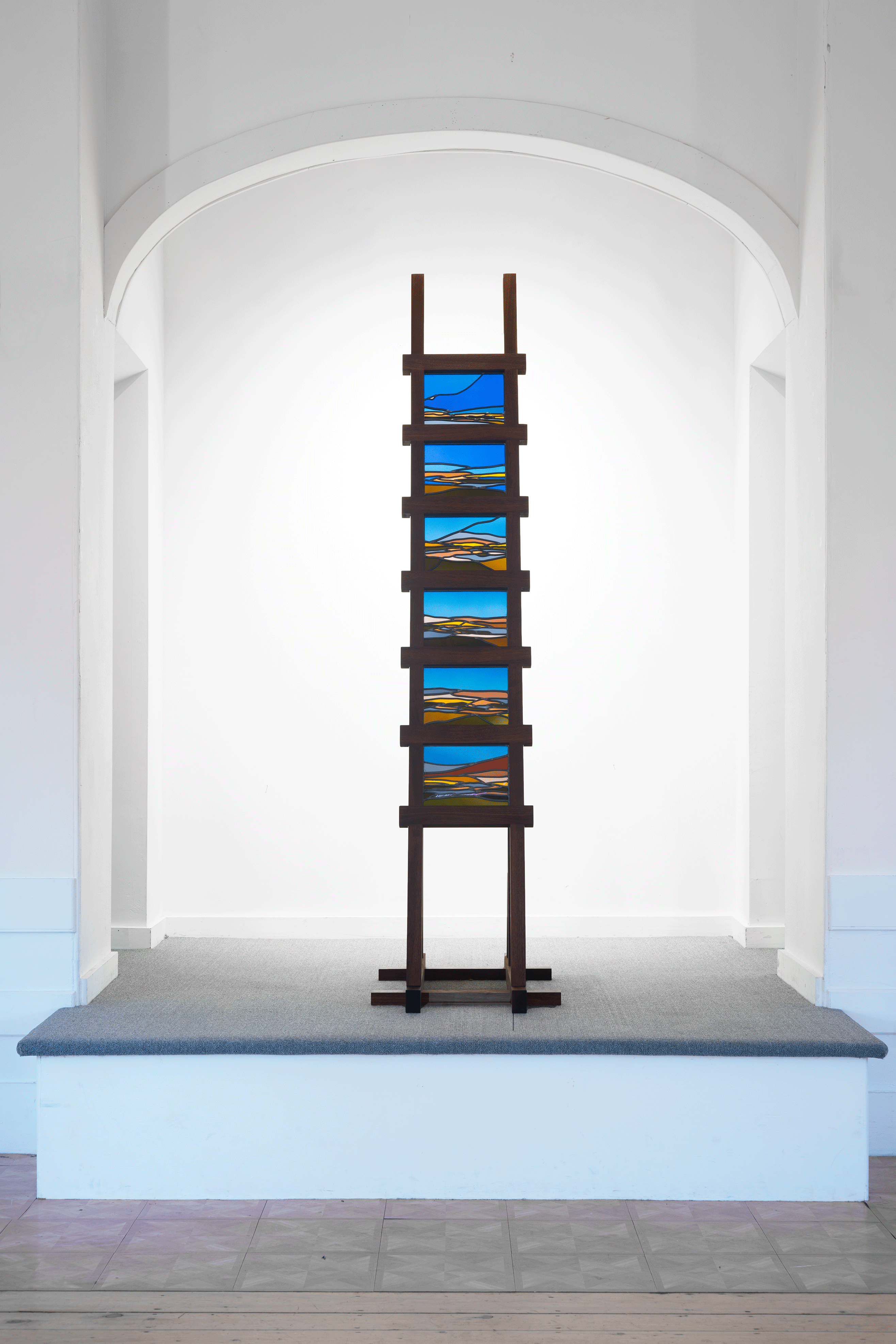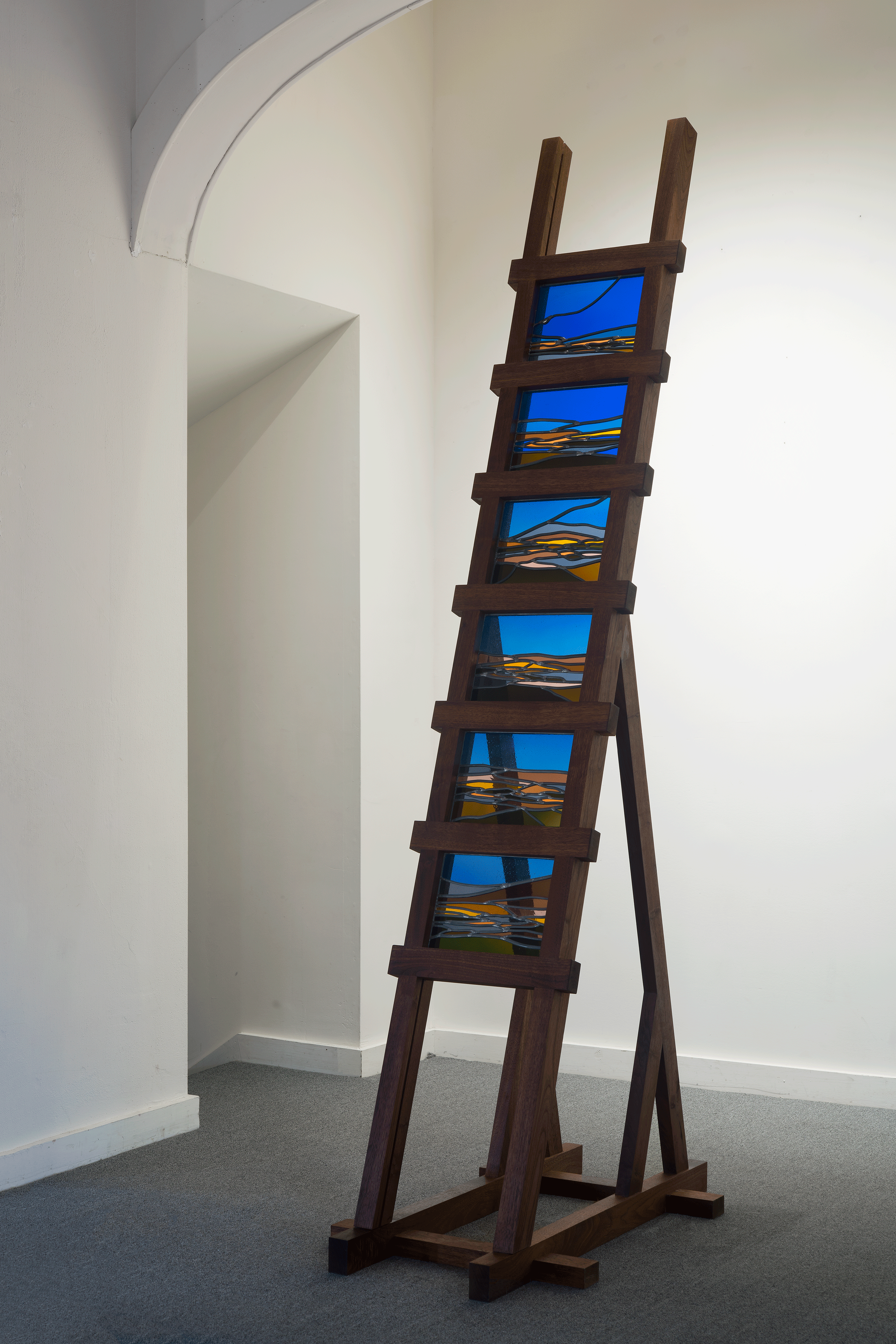 A poetic ladder weaves a landscape of sea and sky. Warm earthy tones slowly disperse and disappear into the majestic blue night sky, giving way to infinite space and wonder. The design was inspired by the feeling of ascending that transpired while contemplating the wild and astonishing beauty of nature at Conomo Point, in Essex, Ma.